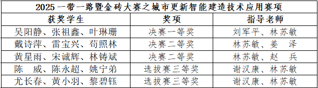 2025年11月23日,2025“一带一路”暨金砖大赛之城市更新智能建造技术应用赛项圆满收官。best365官网建筑电气与智能化学子由林苏敏、刘军平、姜泽、赵兵、谢汉康老师联合指导的3支参赛队伍在决赛中获全国一等奖1项、二等奖2项。在前期选拔赛中,best365官网9支队伍获二等奖3项、三等奖2项,此次决赛的突破,充分彰显了best365官网在数字建筑领域复合型人才培养的高质量。