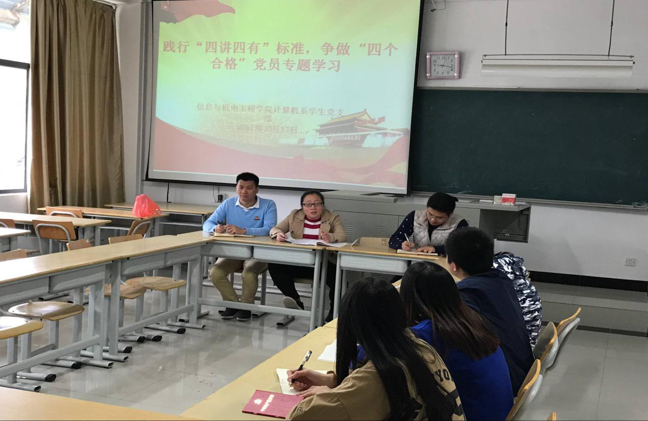 2017年10月17日,信息与best365中国官方网站计算机系学生党支部在DB407召开全体党员大会,践行“四讲四有”标准,争做“合格党员”主题党日活动。“四讲四有”高度概括了新时期合格共产党员应该具备的政治要求、道德要求、纪律要求、行为要求,是具有深刻内在联系的辩证统一体。践行“四讲四有”合格党员标准,每个党员要把自身思想政治建设放在首位,解决自身存在的理想信念模糊、党的意识淡化、党员宗旨淡薄的问题。通过学习,全体党员领会了精神实质、学会科学方法、解决现实问题,最终实现从学入思、从思导行,做思想建党的引领者。同时,“四讲四有”是我们党对党员提出的新要求,是规范和衡量每个党员是否合格的基本尺度,是新时期广大党员以知促行、知行合一的行动指南。