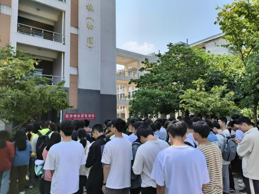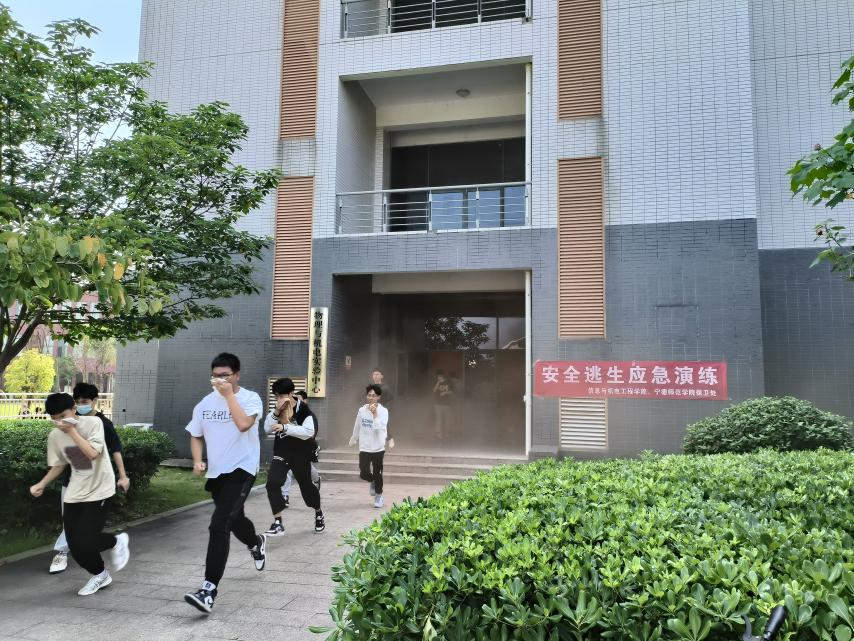 14:30分,工作人员在楼内释放烟雾弹并且拉响警报,学生在各层指导教师指引下下,有序进行火灾应急疏散演练,各楼层学生安全抵达求索大道空旷区域,演练完毕后,保卫处工作人员为学生普及防灾减灾知识。本次消防安全逃生应急演练从警报响起到全体参演人员全部达到指定地点大约用时2.8分钟。