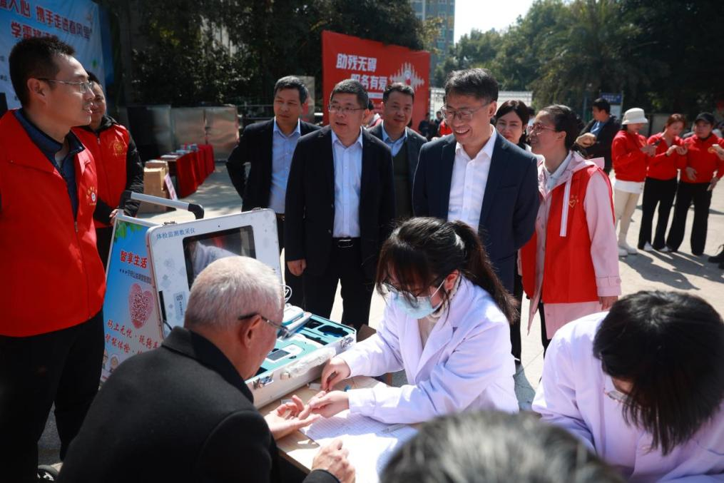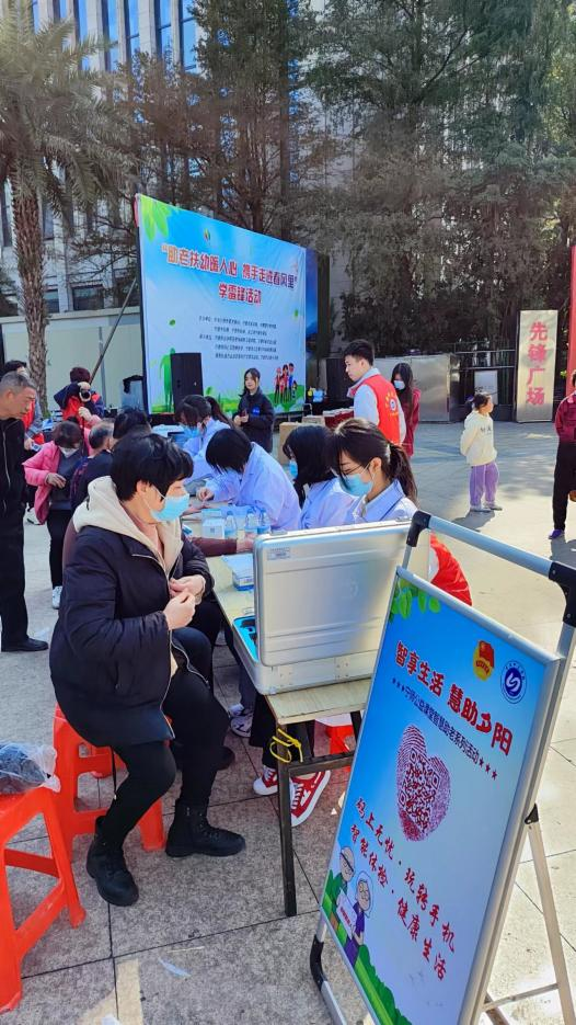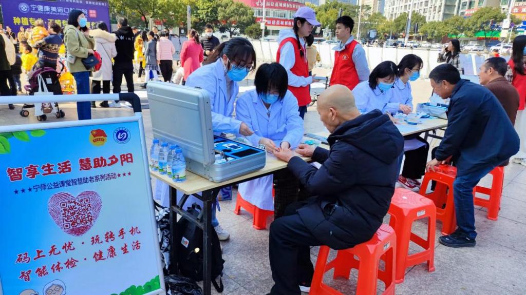 广场上,同学们携带自主开发的便携式智能体检箱为老人进行认真细致地健康检查,热心地为老年人普及健康知识。智能体检仪能同时检测多项生理体征,对体征数据进行自动采集、存储,并通过大数据分析平台对采集的数据进行处理,并在此基础上对体征状态进行智能分析。