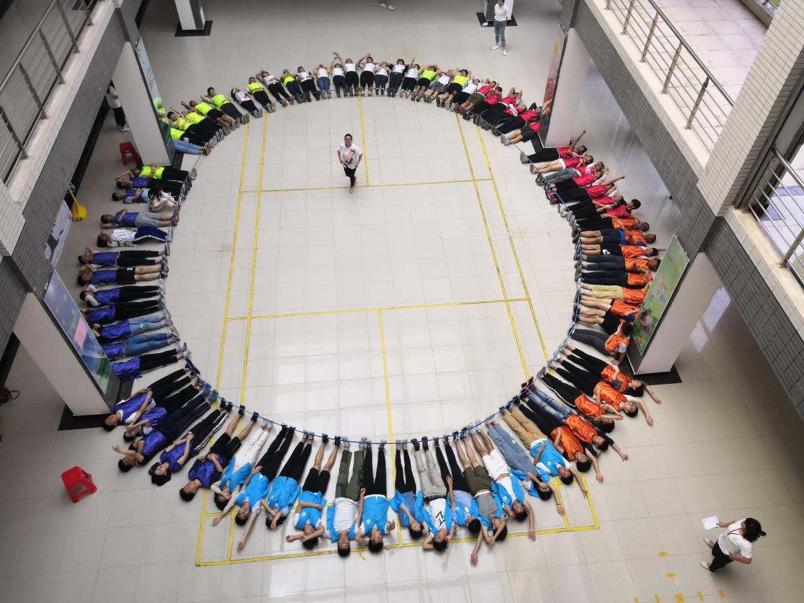 欧嘉烟老师先介绍本次团体辅导的目的与意义,并将八十多名学生分组成六个团队以便开展活动。在热身环节中,各队的每位成员通过“滚雪球”游戏,向大家介绍自己的年级、班级、姓名,要求其他人要在规定的时间内记住全体队员的信息,老师随机选择一位同学考核,速度最快且全部答对者获胜,这个活动促使大家讯速熟识起来,为后面开展活动奠定了基础。在正式活动环节中,首先,进行团队建设,要求每个团队确定队名、队歌、口号,并展示自己的风采;其次,通过“人椅”活动和“超级链接”活动锻炼大家的团队合作、协调能力;“我们都是一家人”活动,让每队人员都自行围成一圈,说出一个字拍前面的人肩一下,然后左手拍右手一下,以此类推,为的是让大家放松身心;在“动力圈”活动中所有人紧紧拉着绳索,每队出两位成员参与比赛,一位在绳索中行走,一位搀扶着保证安全,用时最短的组获胜,这项活动加强了同学们间的信任;最后,分享心语心愿,每位参与者分享心得,并在成长树上写下自己的愿望,活动结束之际成员之间互相给予祝福。