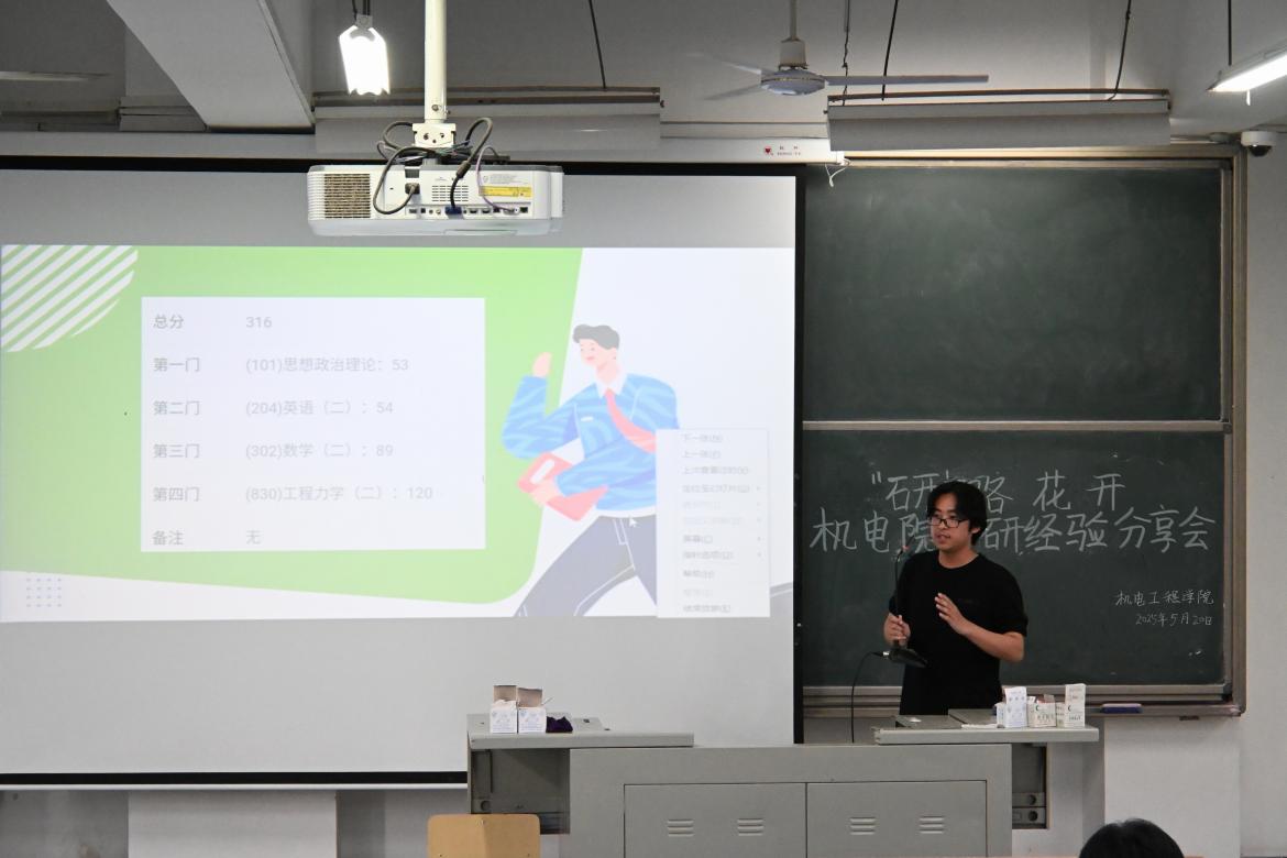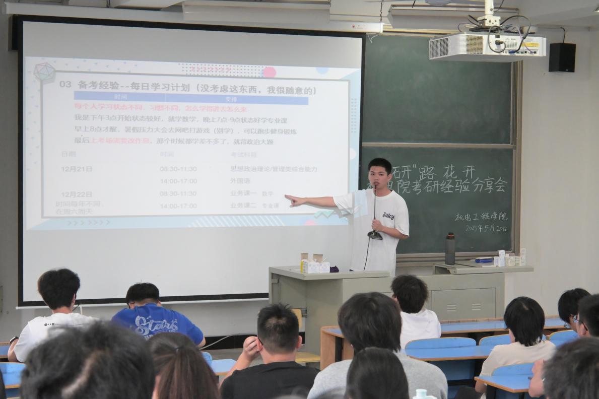 2025年,best365中国官方网站共有18名学生考取研究生。为持续推进“钢铁炼成计划”,best365中国官方网站于2025 年 5 月 20 日下午 16点在教室 DB301举办考研经验分享会。本次活动邀请到三位考研成功学生孟鑫豪、程烨、李致远为大家分享备考经验。现场座无虚席,共有来自三个年级 50 余人参加了本次讲座,众多怀揣考研梦想的同学前来聆听。