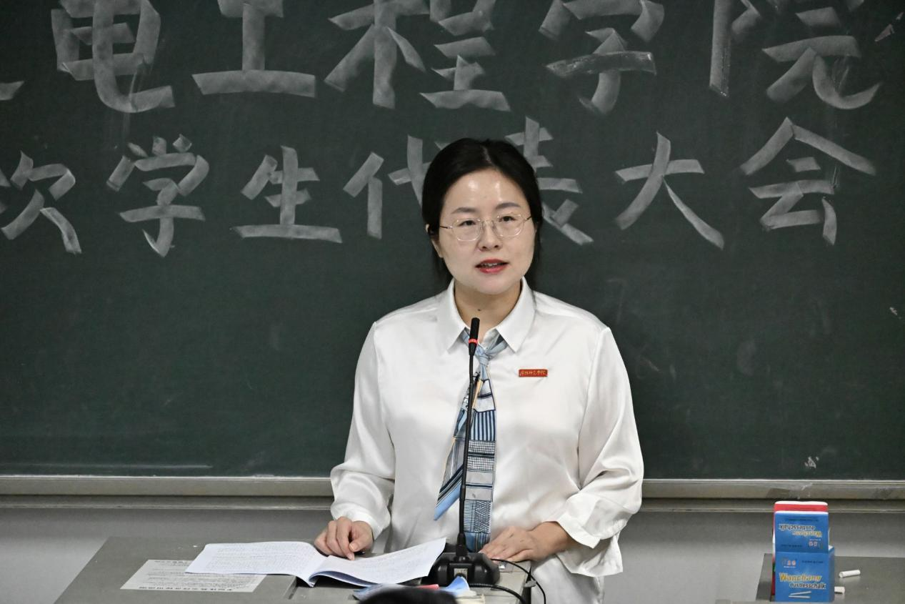 王佳佳老师对大会的圆满召开及新一届学生会主席团成员、校级学代会代表的产生表示热烈祝贺,充分肯定上一届学生会在服务学院发展、助力学生成长中取得的显著成效。同时,她对新一届学生会提出三点要求:一是坚守服务同学初心,密切联系学生、解决实际问题;二是强化责任担当,主动融入学院发展大局,在学风建设、校园文化等工作中积极作为;三是锤炼过硬本领,打造政治坚定、作风优良、能力突出的学生骨干队伍。她鼓励全体学生代表以此次大会为契机,积极投身学院建设,以青春之力书写机电学子的奋进篇章。