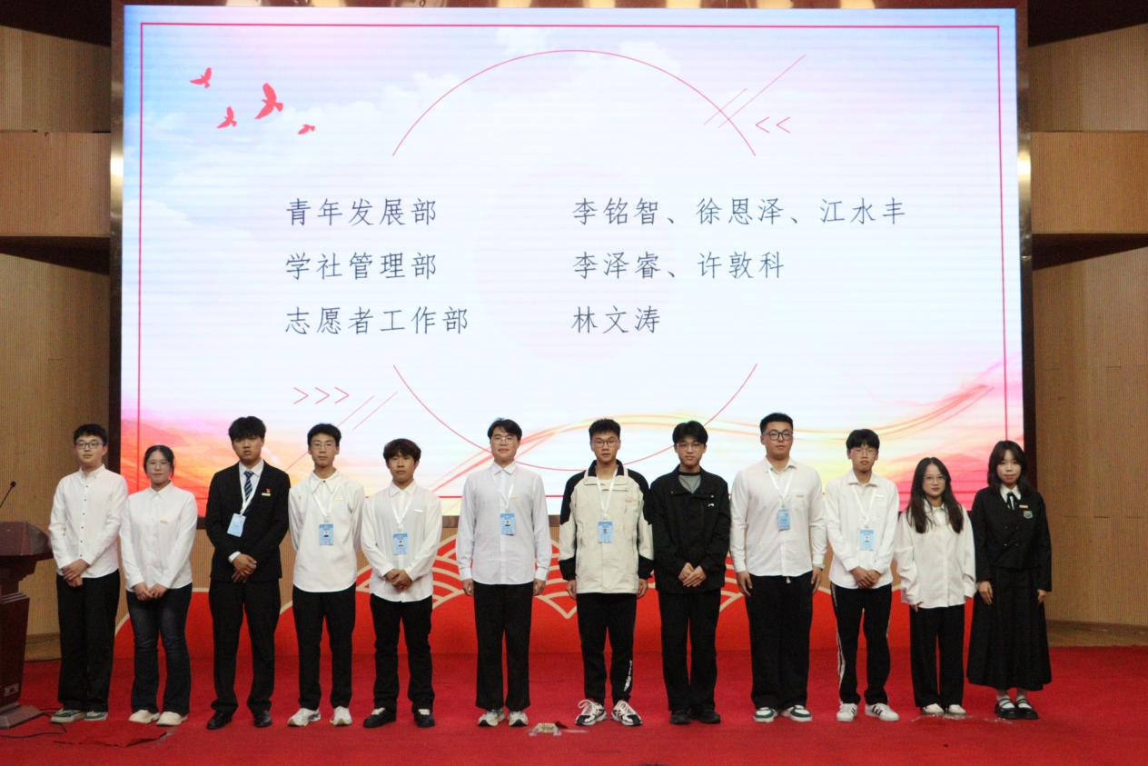 原团委学生会主席吴恩泽、原团委副书记黄夏怡发表讲话,他们对一年的工作进行了总结,对新一届团委学生会提出了殷切希望,王佳佳老师、黄泳华老师对原团委、学生会主席团成员颁发聘书和水晶杯,袁灵逸老师为团委、学生会优秀成员颁发荣誉证书。